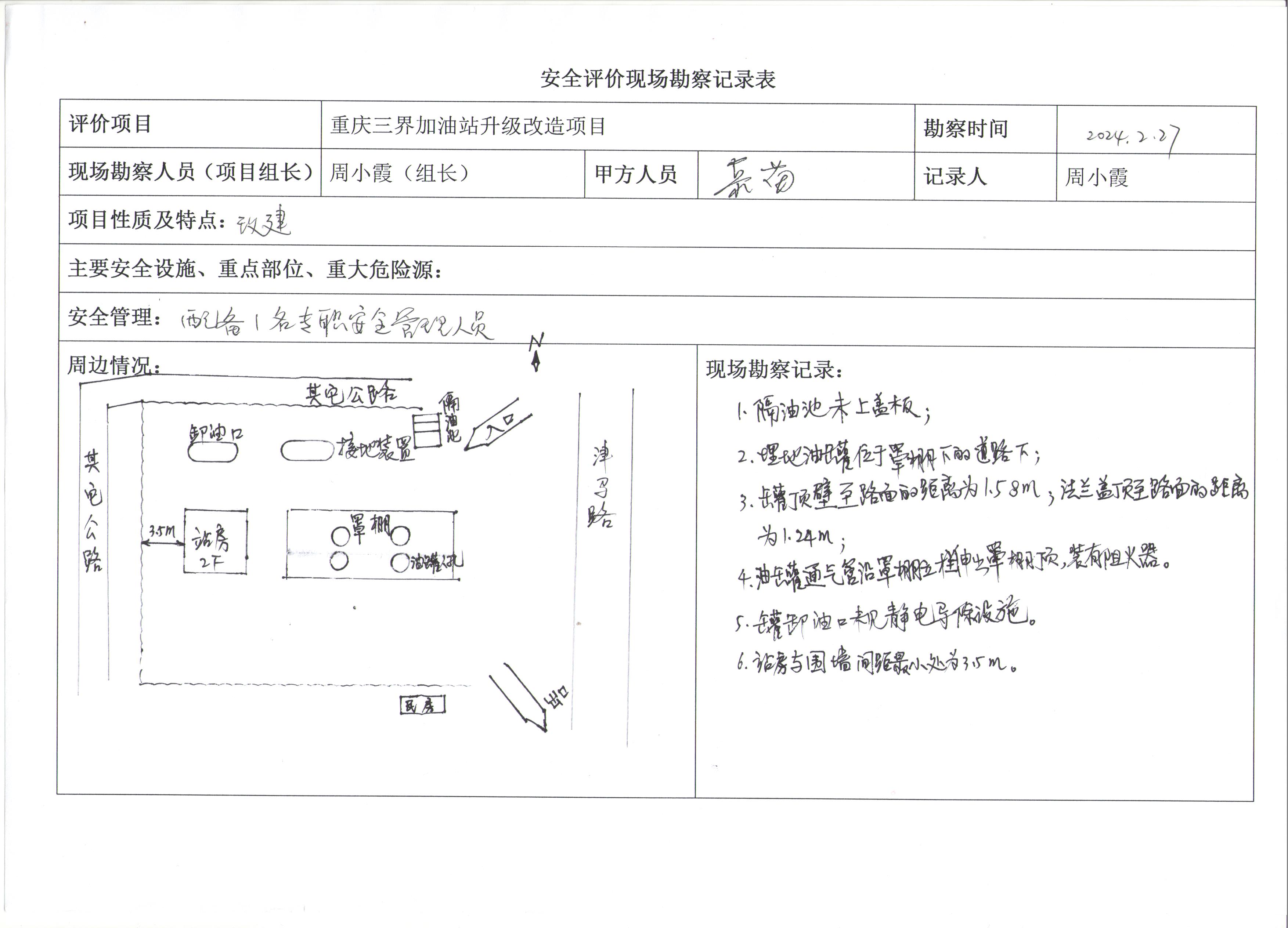 項(xiàng)目名稱 | 重慶三界加油站有限公司重慶三界加油站升級(jí)改造安全驗(yàn)收評(píng)價(jià) | 合同編號(hào) | DA(渝)-PJ-20240129 | |||||