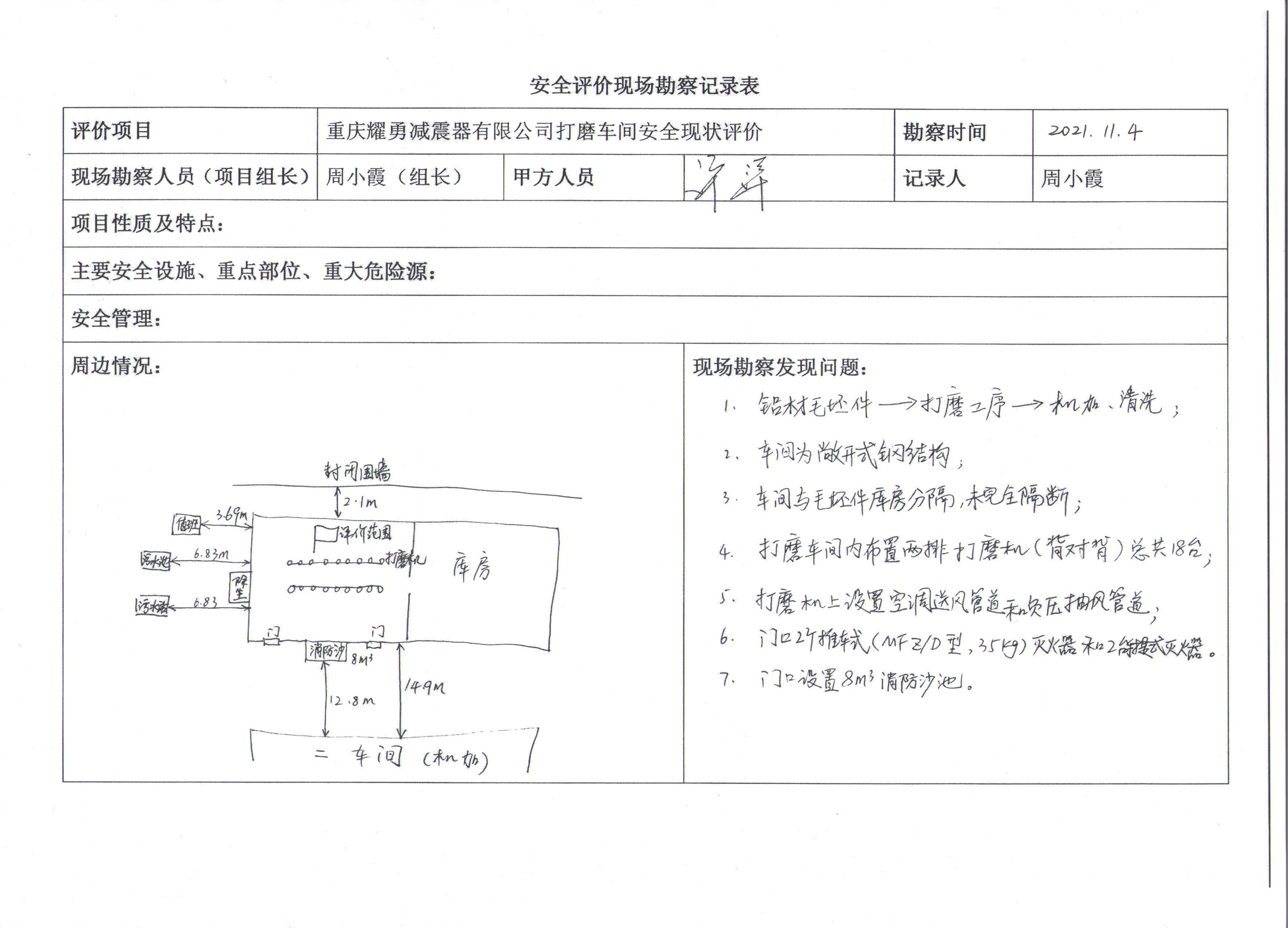 項(xiàng)目名稱(chēng) | 重慶耀勇減震器有限公司打磨車(chē)間安全現(xiàn)狀評(píng)價(jià)報(bào)告 | 合同編號(hào) | DA(渝)-PJ-2021004 | |||||